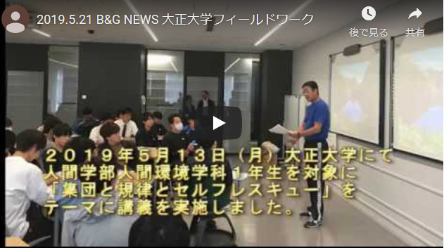 5月13日(月)大正大学にて、同大学の人間学部人間環境学科の一年生を対象に、フィールドワークの授業で「集団の規律とセルフレスキュー」をテーマに、基本的な集団行動法の実技や水辺の安全教育について講義を実施。