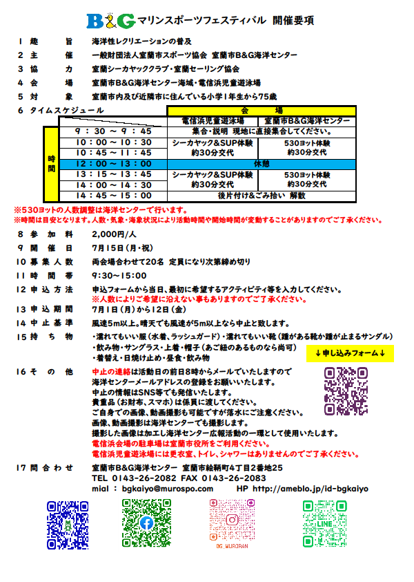 | 主催 | 室蘭市B&G海洋センター | 協力 | 室蘭シーカヤッククラブ・室蘭セーリング協会 |