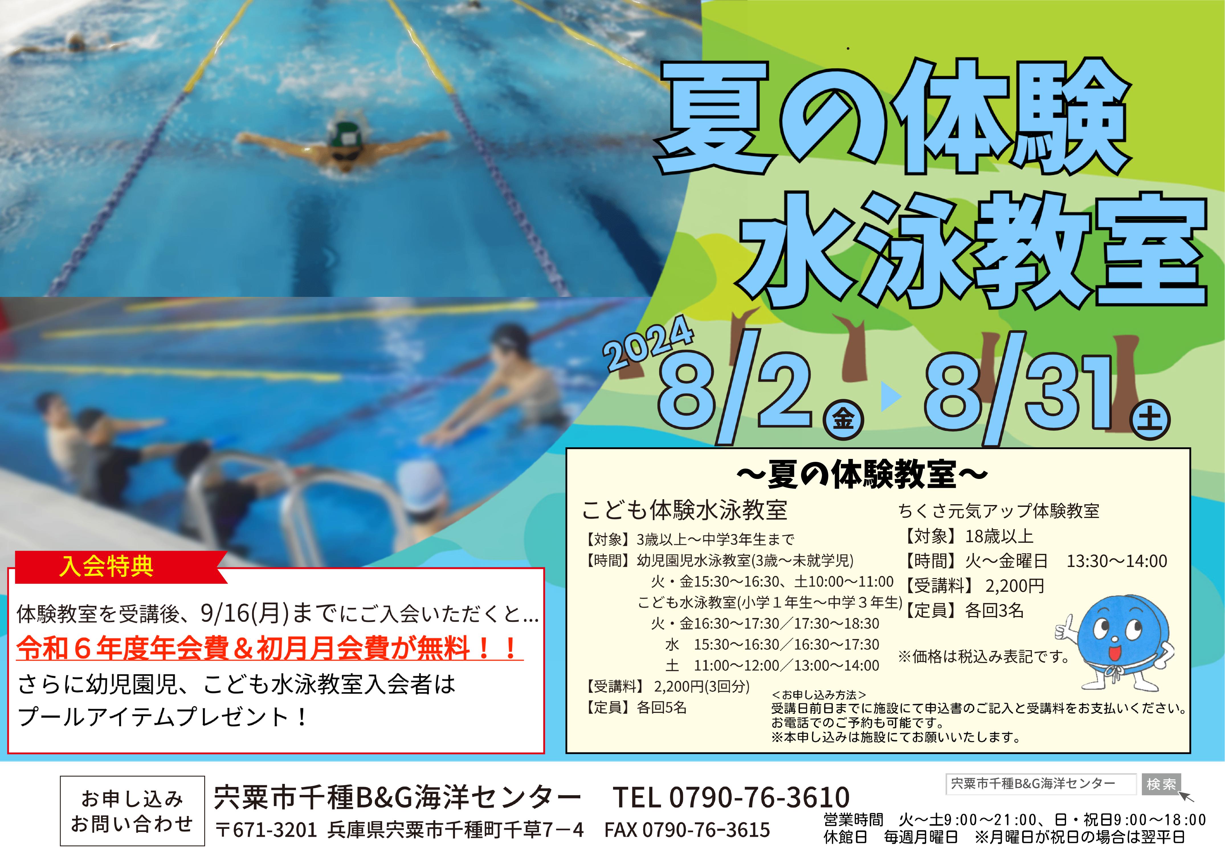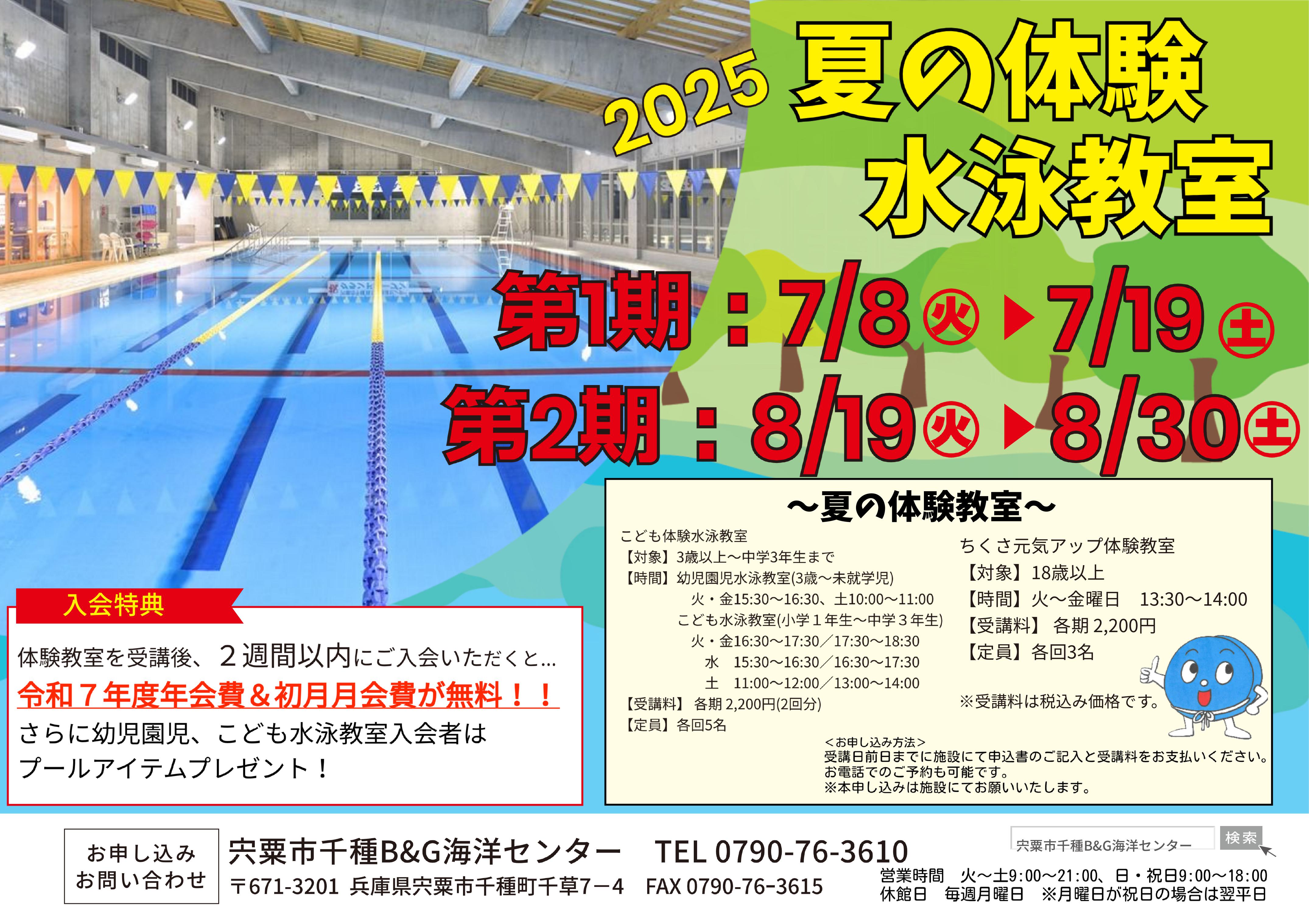兵庫県 宍粟市 2025年 夏の体験水泳教室 第一期今年も夏の体験水教室を開催します! 各教室のの詳細はチラシをご確認ください。 この機会にぜひご参加ください!
