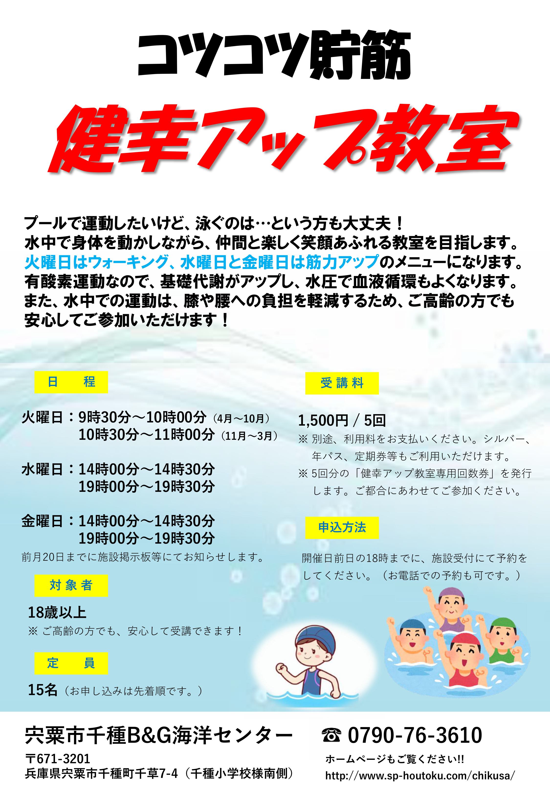 兵庫県 宍粟市 健幸アップ教室昨年度の3月に実施した大人気クラスの健幸アップ教室を、この度常設化することとなりました!! 時間は毎週火曜日の9:30~10:00(冬季は10:30~11:00)、毎週水・金曜…