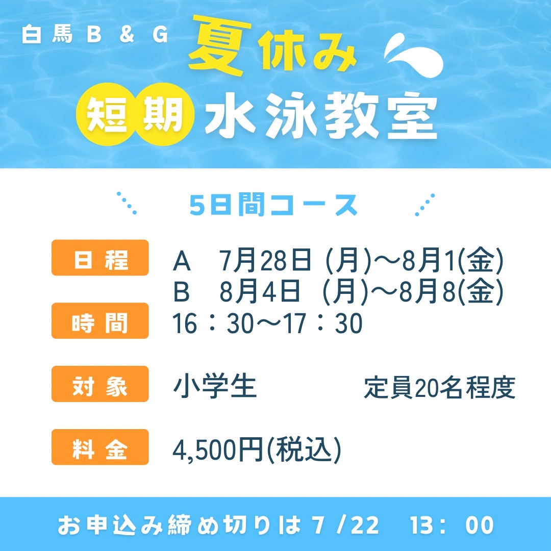 長野県 白馬村 2025白馬B&G短期水泳教室募集のお知らせ夏休みを利用した短期水泳教室です。5日間毎日練習することで、泳力アップすること間違いなし!AコースとBコース、両方参加も可能です。暑い夏をプールで過ごしましょう!