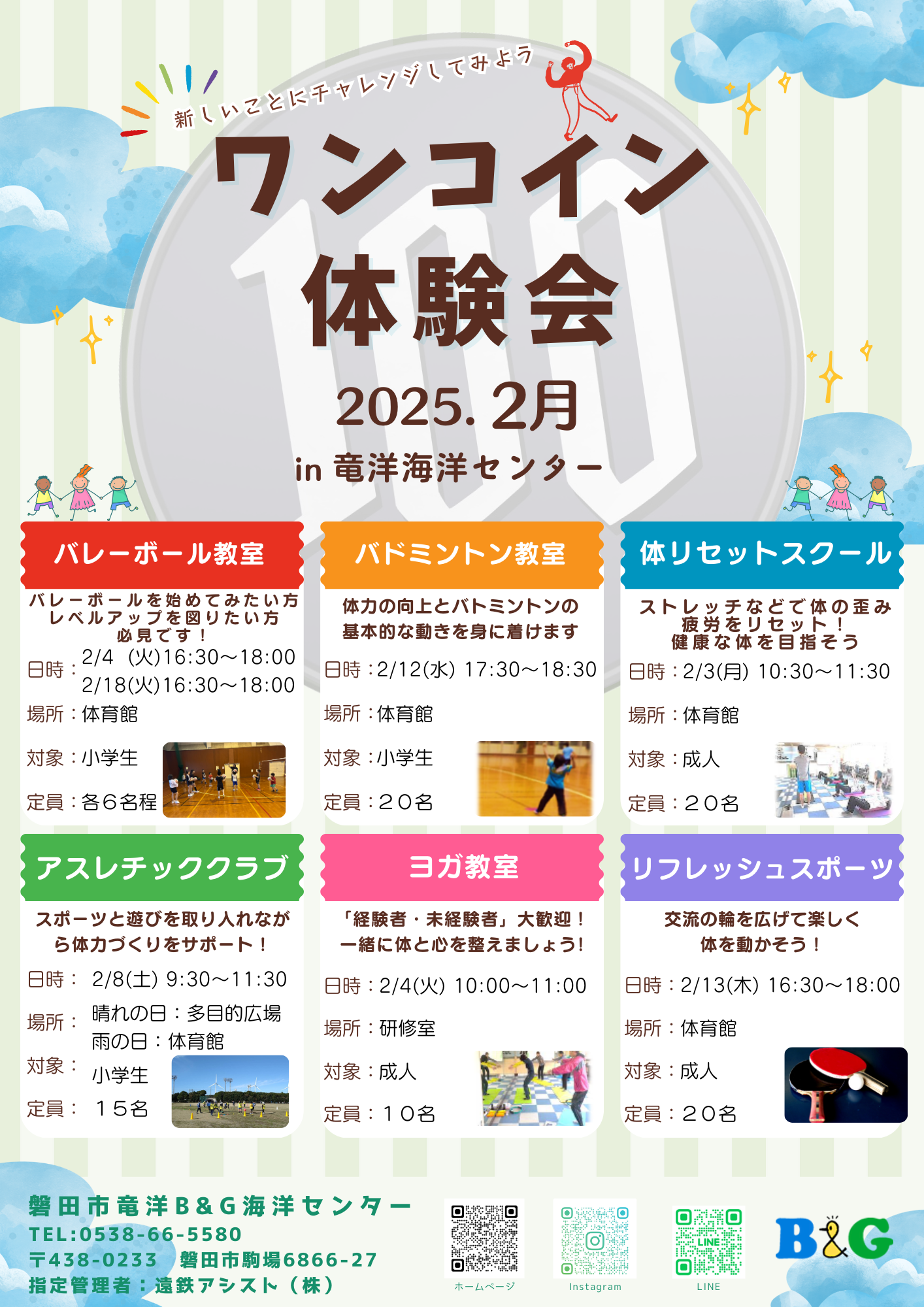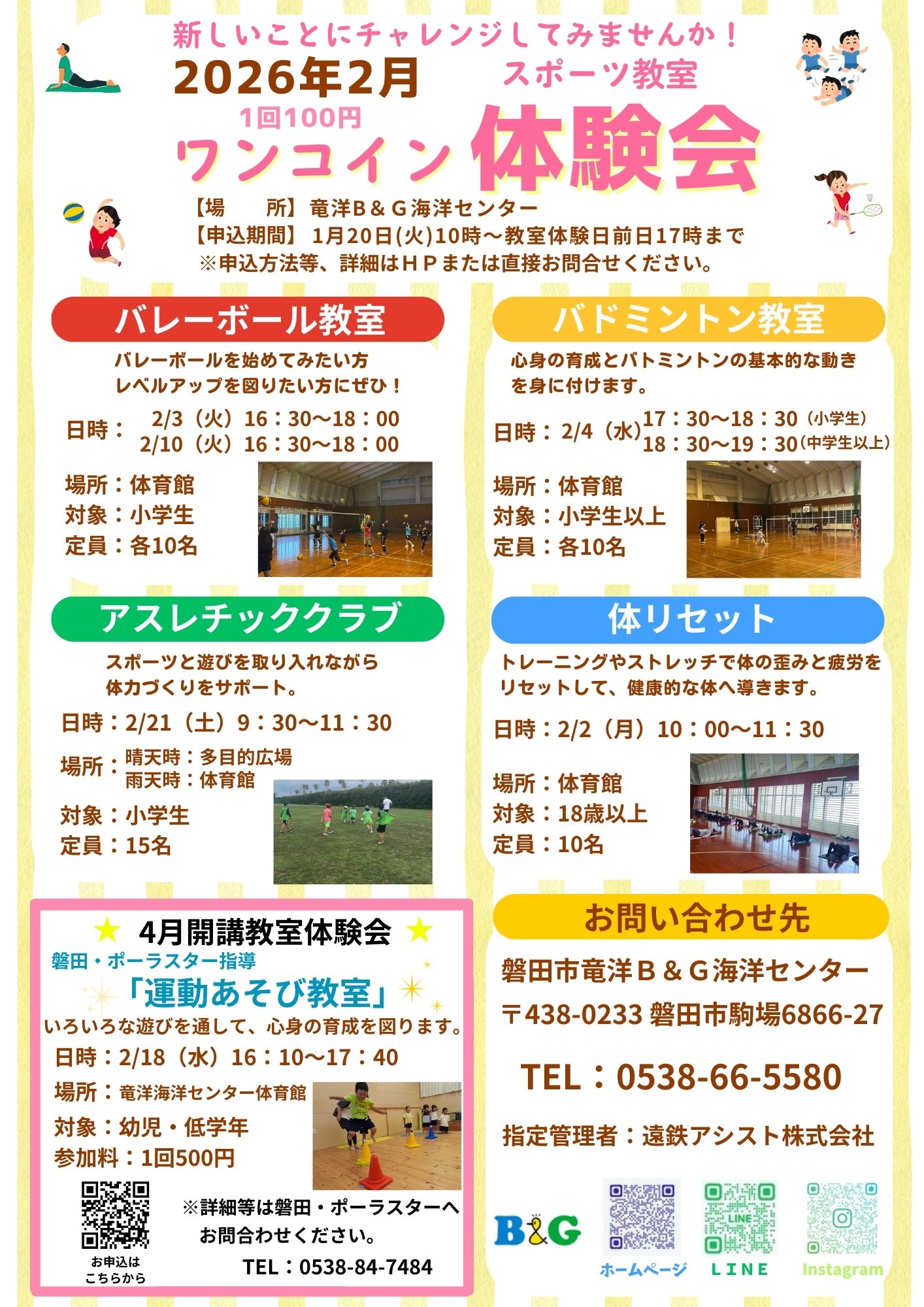 静岡県 磐田市 竜洋海洋センタースポーツ教室ワンコイン体験会現在開講しているスポーツ教室他、2025年度新規開講予定のスポーツ教室をワンコイン100円で体験ができます。 新年になって新たに活動を始めたい人、是非この機会に体験会にご参加く…