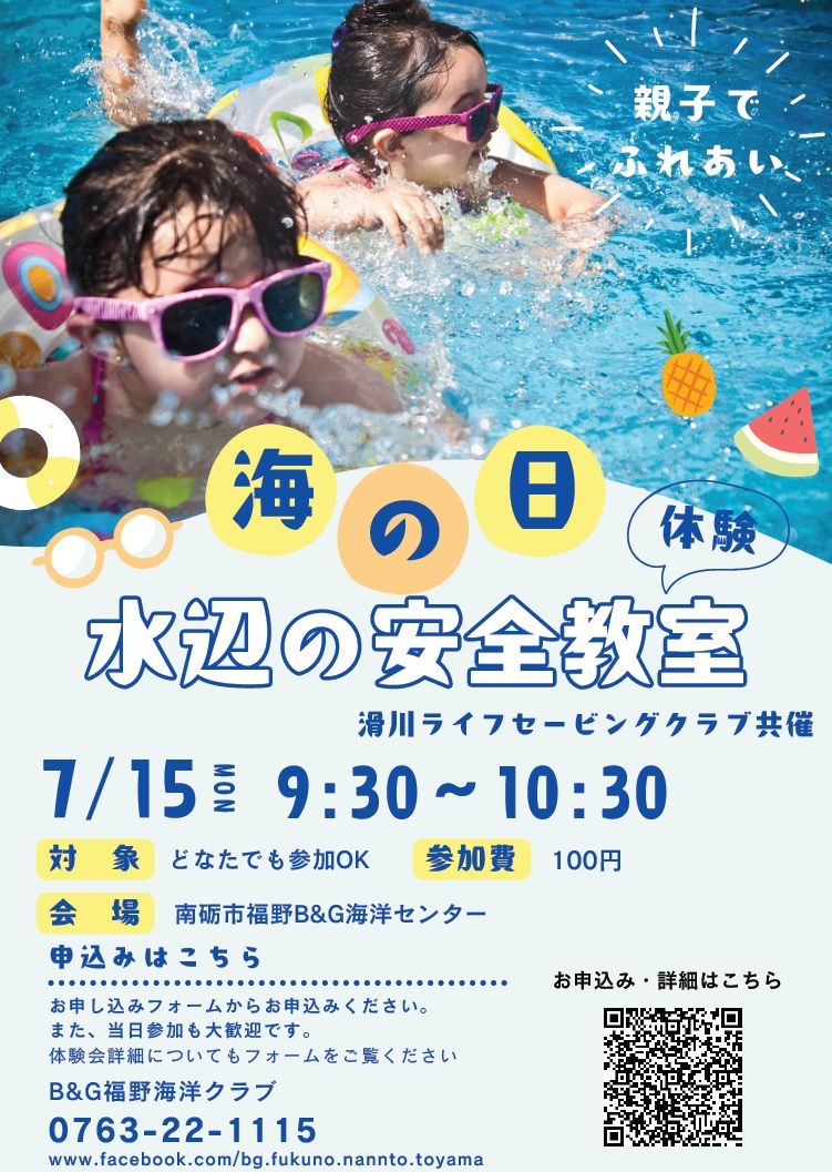 富山県 南砺市 海の日 水辺の安全体験教室夏休み前に水辺で活動するときの安全について学びませんか。 今回は水辺の安全のプロのライフセーバーから色々と学べますよ。