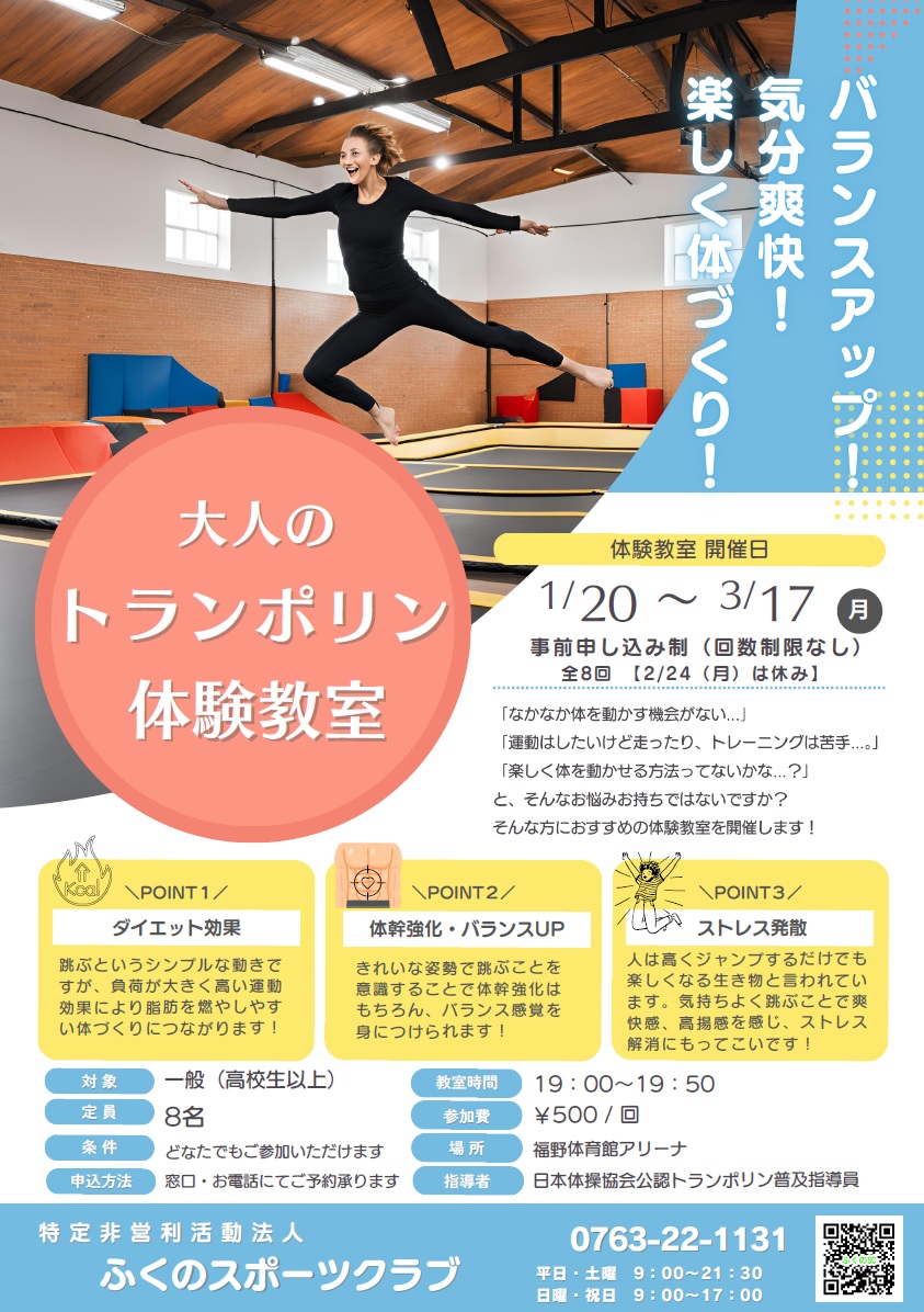 富山県 南砺市 大人のトランポリン体験教室冬場の運動不足解消に非日常空間での運動を楽しみませんか