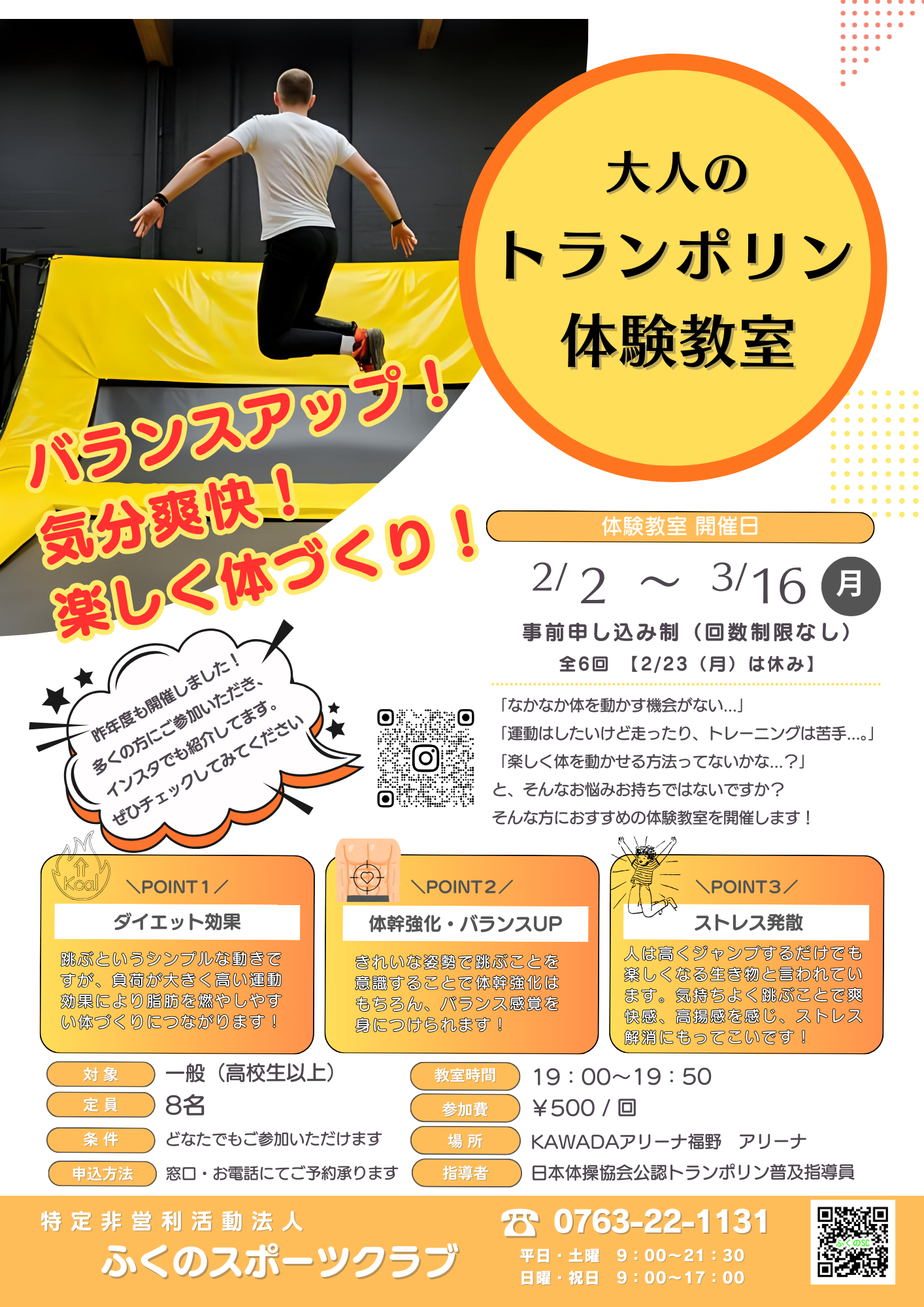 富山県 南砺市 大人のトランポリン冬場の運動不足解消と春にむけた体力づくりを非日常空間で楽しみながら養いましょう!