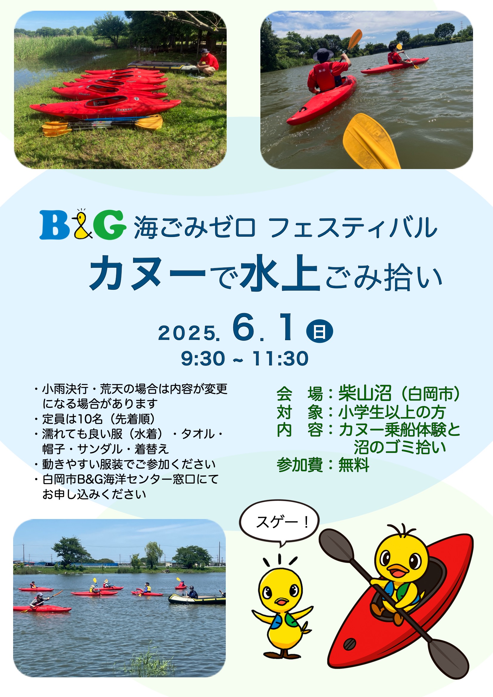 埼玉県 白岡市 B&G海ごみゼロフェスティバルin柴山沼水辺のゴミを減らし、海や川で楽しく遊べるように、柴山沼周辺と水上のゴミ拾いを行います。。清掃活動をすることで、身近な場所が地球環境問題につながることを考えるとともに、水の怖さや備…