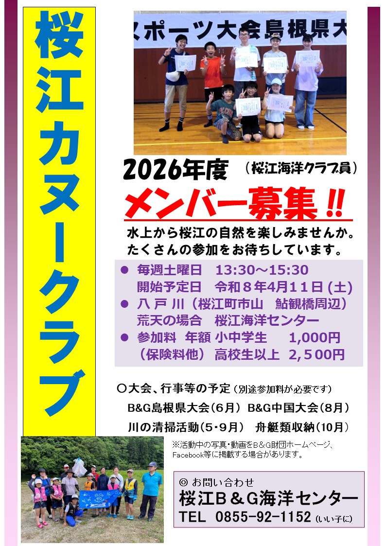 島根県 江津市 江津市桜江B&G海洋センターカヌー教室今年もカヌー教室を始めます。自然い囲まれた桜江町の八戸川でカヌーを楽しみましょう。大人の方も歓迎します。