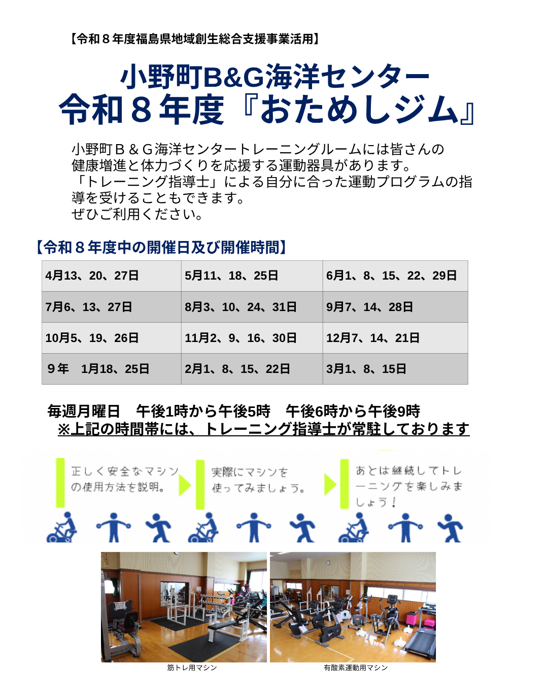 福島県 小野町 令和8年度「おためしジム」毎週月曜日開催 海洋センタートレーニングルームで無料のジム体験を開催しています。 「トレーニング指導士」による自分に合った運動プログラムの指導を受けることもできます。