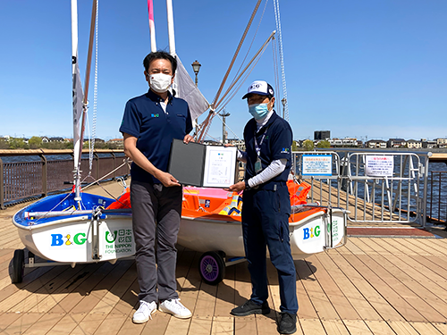 関係者が見守る中、B&G財団 理事長菅原悟志から久川代表にバリアフリーヨット「ハンザ級ディンギー」ほか総額200万円の舟艇器材の目録が手渡されました。