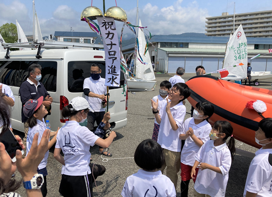 器材配備を受けた堀野代表は「兵庫ジュニア海洋クラブは、小学2年生から中学3年生まで合計22名が、週2回のペースで練習しています。そして、レースがある時は日本全国トレーラーで救助艇を引っ張って出場しています。活動の主役は子どもたちですが、保護者の一番大切な務めは“海に出る子どもたちの安全を守る”ことです。そのため、新しい救助艇の配備は本当に心強く嬉しく思います。そして、この日を迎えることができたのは、海洋クラブ員の日々の活動の積み重ねだと思っています。これからもいきいきとセーリングしていきましょう」旨お話しくださいました。配備式後は、クラブ員と保護者の手で「カナロア」と命名された救助艇の進水式が行われ、早速伊藤市長にも乗船いただいて芦屋の海を航走しました。