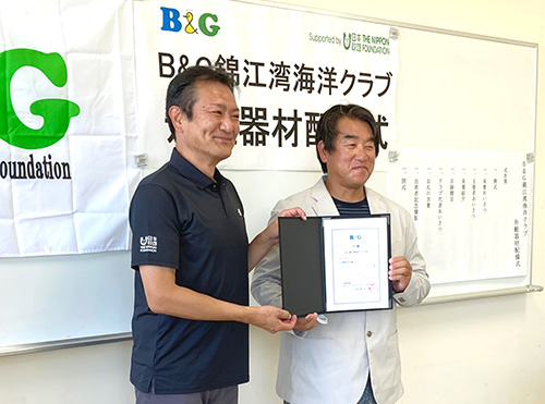 出席者が見守る中、B&G財団 理事長菅原悟志から安部代表にサーフスキー3艇など総額100万円の配備器材の目録が手渡されました。
