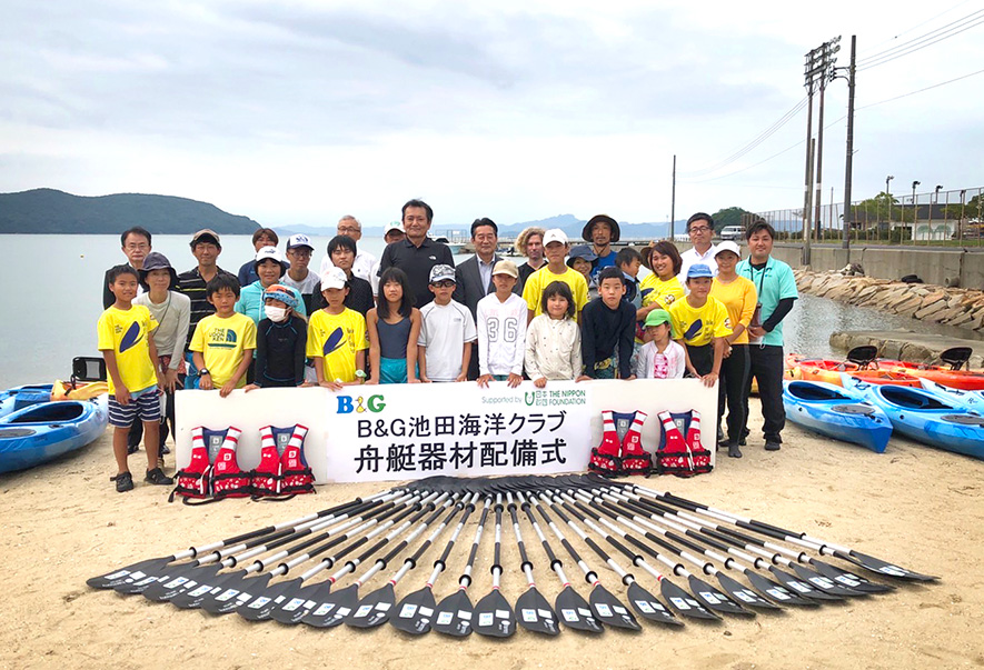 8月28日、小豆島ふるさと村を拠点に地域の子どもたちや観光客にマリンスポーツや環境教育を行う「B&G池田海洋クラブ」への舟艇器材配備式を実施しました。