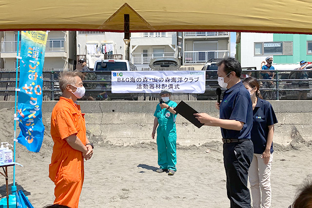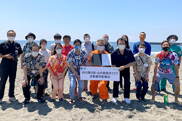 B&G財団理事長の菅原は「これまで行ってきた海洋環境教育や海浜清掃の更なる充実を図るほか、新たに親子対象のスキンダイビングなど、親子での体験を通じて、活動の幅を広げ地域に貢献していただきたい」と挨拶し、ライフジャケットやスノーケルセット、マリンシューズなど今回配備する総額約80万円の活動器材の目録を豊田氏に手渡しました。