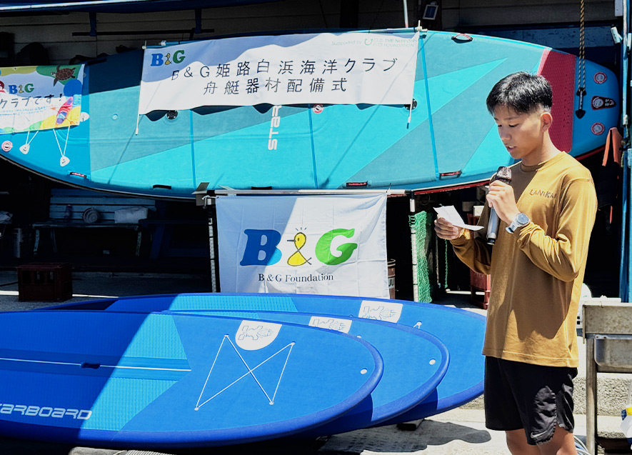 B&G財団常務理事の朝日田智昭は、今回新たに配備された舟艇器材と、海洋クラブ関係者の熱意が重なり合うことで、人と海をつなぐ場がさらに広がることを期待していると挨拶し、総額100万円の舟艇器材の目録を海洋クラブ代表の松本氏に手渡した。