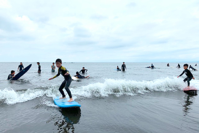 片瀬西浜海岸でのサーフィン教室の様子