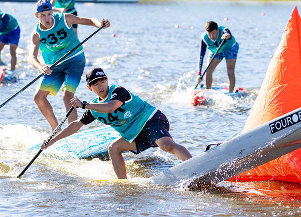海洋クラブ代表の下境田氏は、岡山市内でマリンスポーツショップを経営していたが、8年前に牛窓の魅力に惹かれ瀬戸内市に移住。SUPを広く普及するためスクールを開始した。現在、スクール生は約50人にのぼり、大会・レース出場に向け、日々練習に励んでいる。
