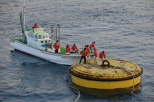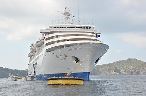 27日の早朝、「ふじ丸」は予定どおり小笠原諸島父島の二見港に入港。「ふじ丸」は大型客船のため、着岸できないことから、港内のブイに係船し、渡船に乗って父島に上陸しました。