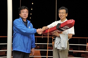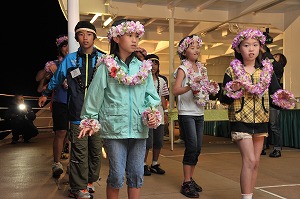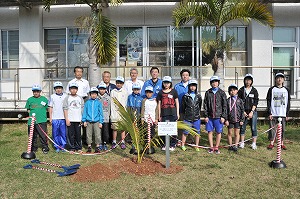 寄港地活動に入る朝、東日本大震災の被災地から参加した14人のメンバーが小笠原村役場を訪れ、復興を祈念する植樹を行いました。挨拶に立った森下村長は、「震災時には小笠原にも津波が来ました。私たちと皆さんのまちは海でつながっているのですから、心もひとつです。ぜひとも早い復興を祈っています」と励ましてくださいました。