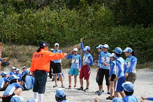 東講師によるレクリエーションをビーチで楽しみました。今回のゲームは、「オリンピックメダル選手大会」と題して金銀銅メダルをジャンケンで獲得していく内容です。勝つほどに集まるメダル、負ければ減っていくメダルに、皆、一喜一憂して大いに盛り上がりました。
