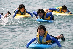 泉田、草柳講師からレスキューチューブやニッパーボードといった、ライフセービングの道具の使い方を教えてもらい、皆で実際に海に出て試してみました。誰もが初めて手にする道具でしたが、両講師にサポートしてもらいながら楽しく体験することができました。