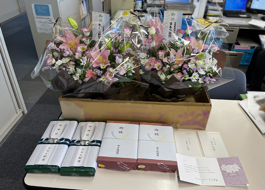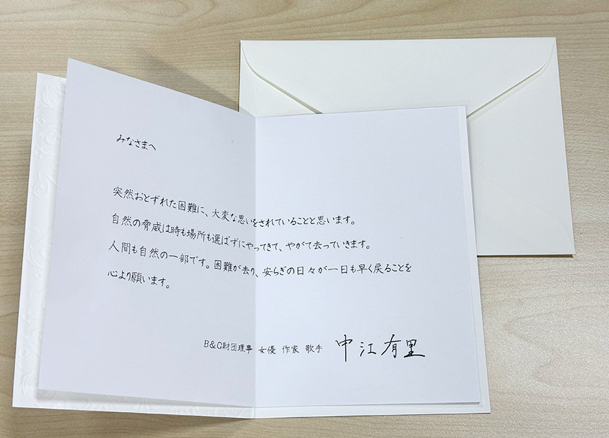 このような現地の状況を鑑み、ご遺族の方々が新盆をお迎えできるよう、遺影などにお供えする、能登地方の夏もなか「利久」や能登名産の「和ろうそく」、フラワーアレンジメントのご進物を用意。お盆となる8月13日に、13世帯のご遺族へ当財団の理事で女優・作家・歌手の中江有里氏からお預かりしたご遺族へあてたメッセージカードも添えてお渡しした。