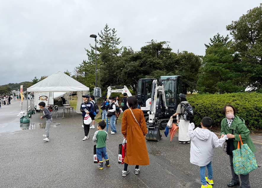 ・今回初めて志賀町の商工会と協働して重機の体験ブースを設置した。イベント当日はあいにくの天候となり操作自体は中止されたが、消防車やパトカーと違い普段あまり乗る機会の無い油圧ショベルを目の前にして子どもたちは目を輝かせていた。子どもたちの姿を見ると、今後も被災した子どもたちが元気になるイベントを積極的に企画したいと感じた。