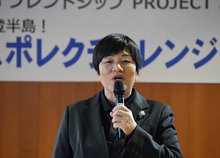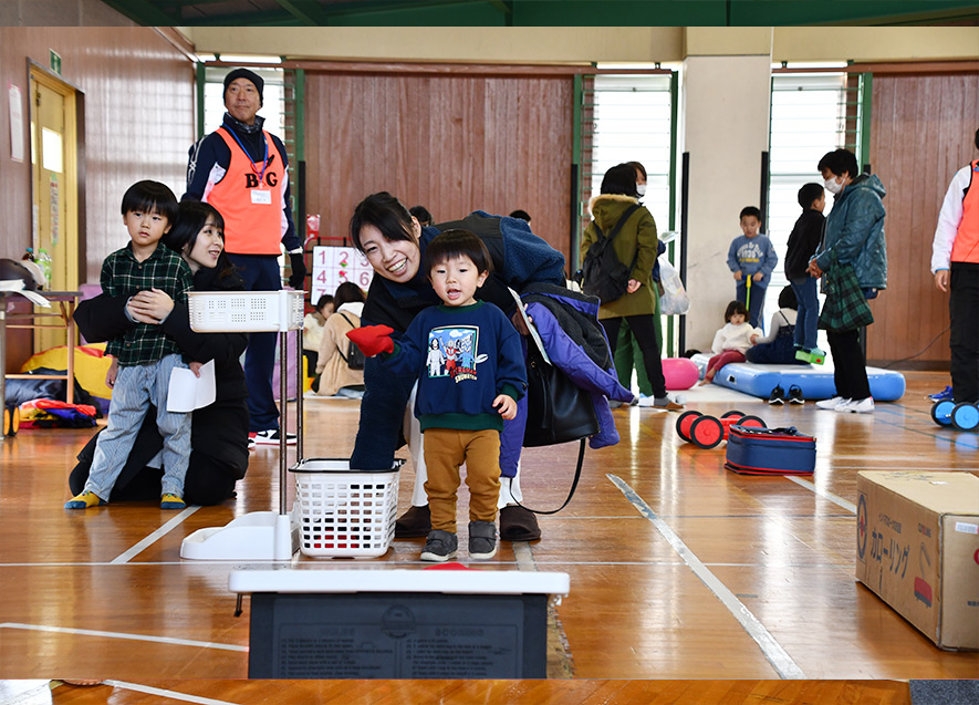 続いて穴水町の大間順子教育長は、支援に感謝を述べ、「皆さんには身体をいっぱい動かし温まり、心もほぐしてほしい。たくさん遊んでまっすぐ元気に育ってください」と参加者に呼びかけた。