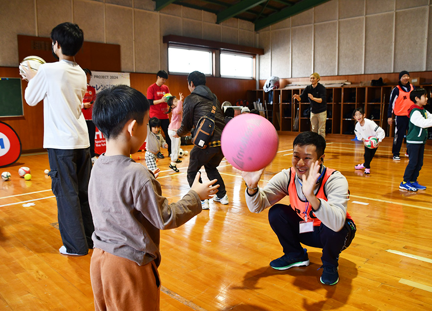 慣れない環境に、はじめは緊張の面持ちで不安そうに参加していた子ども達も、トップアスリートやB&G指導員からの優しい声掛けに少しずつ表情がほぐれ、ボールを使った様々な遊びを通して、夢中で身体を動かした。