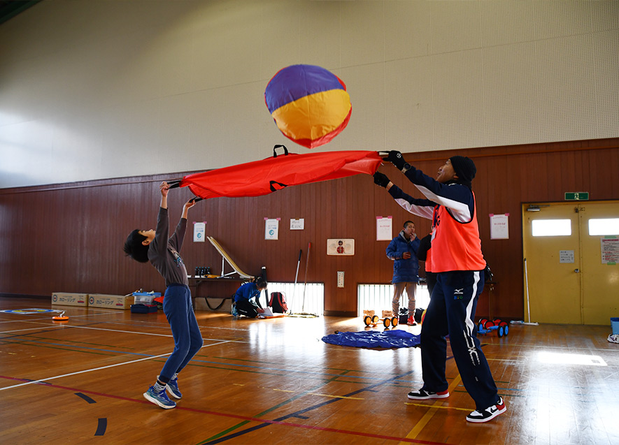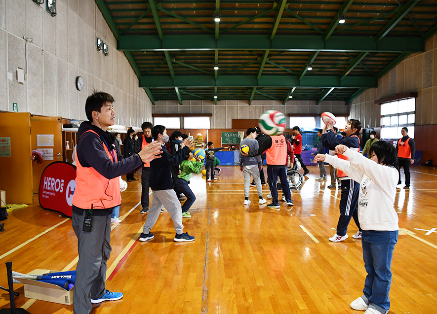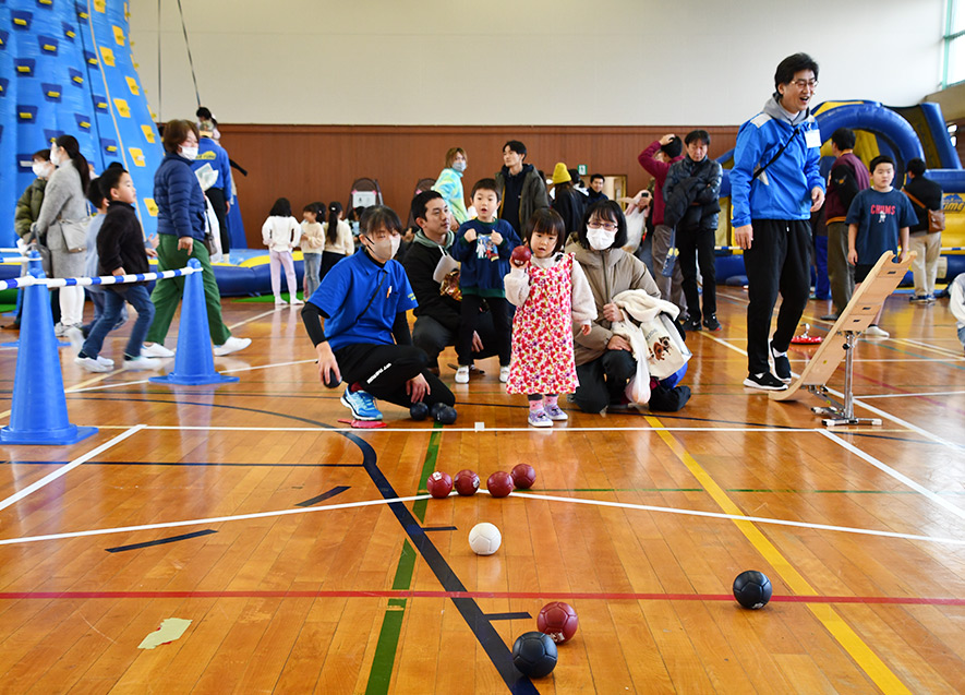 14日午後と15日は、一般開放を行い、穴水町・志賀町在住の幼児から中学生および保護者が参加。HEROs石井氏・生山氏によるスポレク教室を2回実施したほか、石川県障害者スポーツ協会の協力により、多世代が体を動かしながら一緒に楽しめる各種ユニバーサルスポーツ体験ブース(陸上競技用・車いすバスケ用車いす、カローリング、ボッチャ、モルック、バッゴー、ラダーゲッター等)を設置。