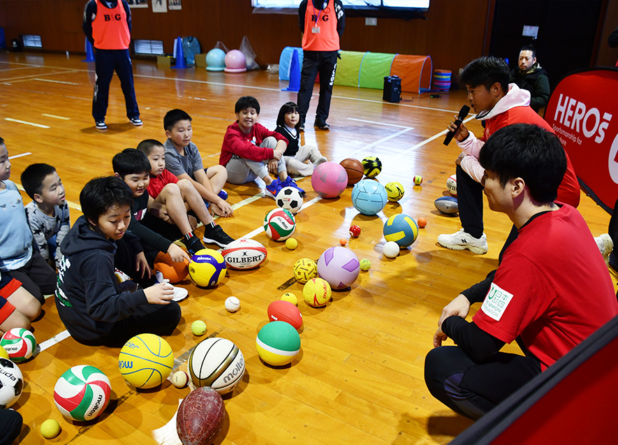 今回は、日本財団「HEROs」の協力を得て、現役プロラグビー選手でありながら、社団法人を立ち上げ親子の遊び場事業を展開している石井魁 氏(浦安D-Rocks所属)と、元プロ野球選手で現在は放課後等デイサービスの代表として障がい児支援に携わる生山裕人 氏が中心となり、ティーバッティングや大小様々な種目のボールを使って楽しく遊べるスポレク教室を行った。