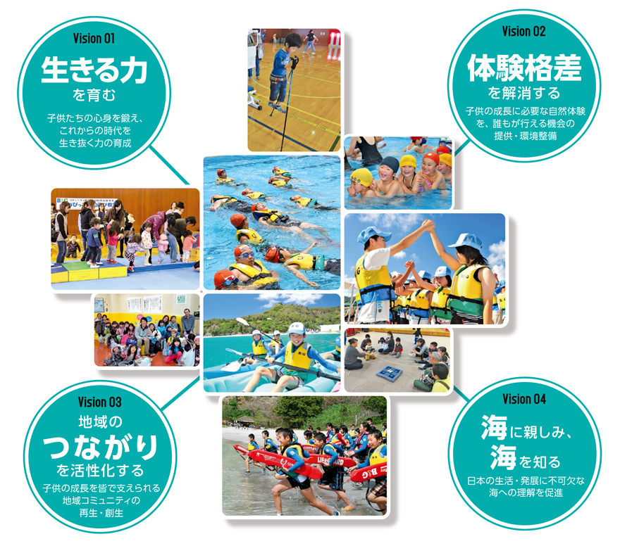 B&G財団では4つのビジョンを掲げ、青少年の健全育成をはじめ、地域コミュニティの再生のため幼児から高齢者までの健康づくりを推進しています。