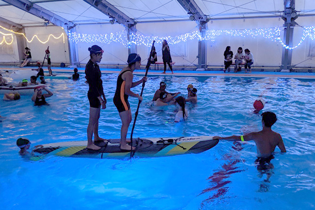 「地域の人々や子どもが楽しんで参加できるイベントを通して、地域の活性化を図りたい」というコンセプトで、水面にバルーンやLEDライトを浮かべて普段のプールとは違った非日常感を演出しました。また、SUPやゴムボート体験なども実施して、アクティビティにも触れていただきました。