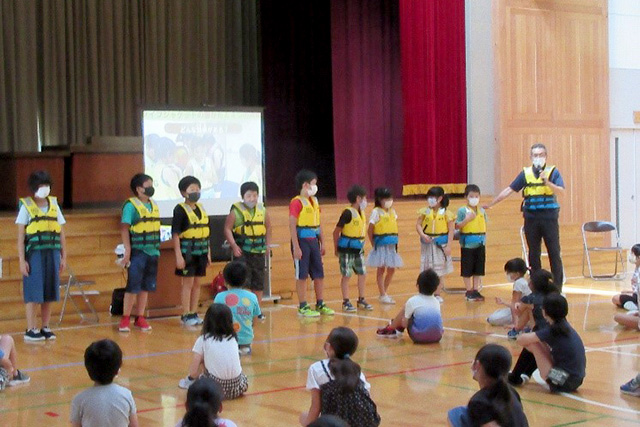 昨年は公民館の青少年教育事業の一環で、近隣の小学校の授業時間に「水辺の安全教室」を実施しました。授業時間を割いていただき、プロジェクターでスライドを映して「自分の命は自分で守る」ことの大切さを伝えました。