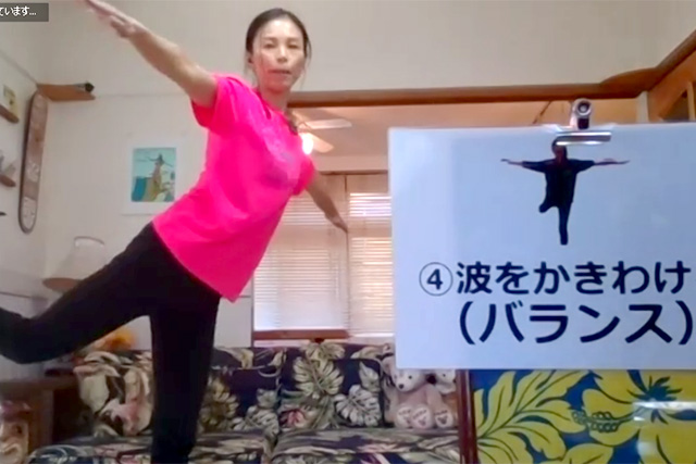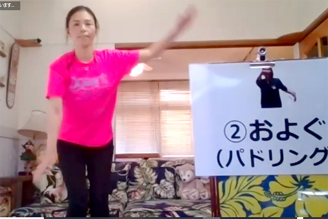 2020年11月28日(土)、新型コロナウイルスの感染が再拡大する中、急遽、オンライン開催に変更して実施。自宅に居ながら、基本動作のトレーニング、音楽に合わせたサーフィンダンス、しりとりゲームなど、楽しみながら汗を流す90分間となりました。