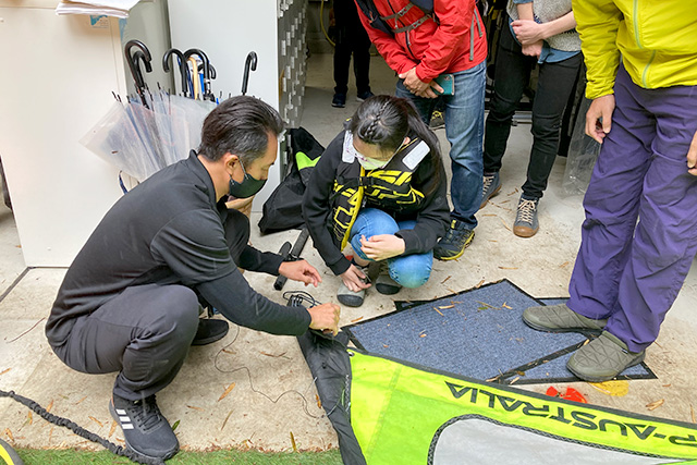 続いて、これから使用するライフジャケットやウェットスーツ、器材を各自で確認を行った後、艤装品の取り付け方について学びました。普段、雷注意報が出たとき以外は水面で活動を行いますが、この日は雨が強く、活動初日ということもあり、陸上シミュレーションで乗り方、降り方、セールアップなどを練習しました。
