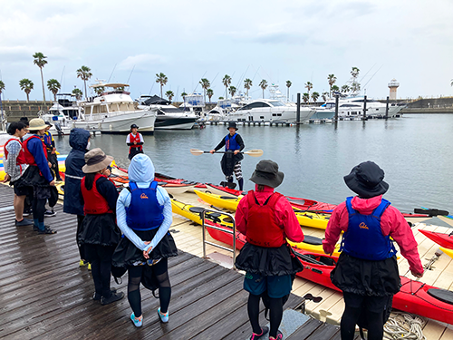 初日に予定していた海水浴場でのカヌー講習は、雨と強風のためマリーナ河芸の港内に場所を移して実施しました。強風に苦労しながらも、学生は徐々に操船に慣れてきました。