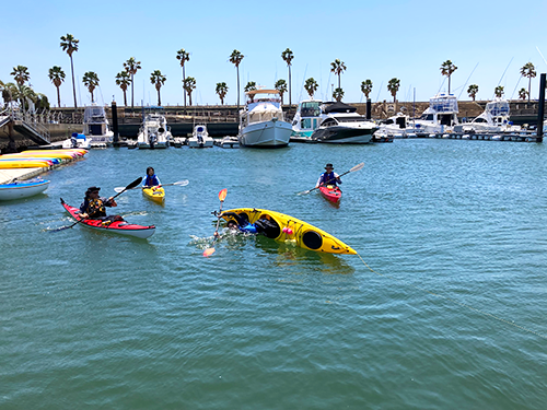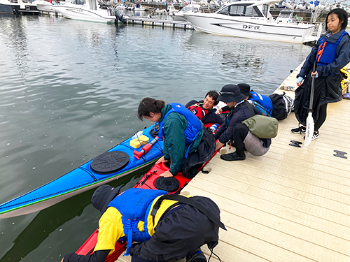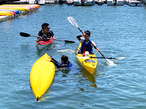 2日目は晴れたものの風は強く、港内でカヌーレスキュー練習。学生はペアになり、カヌーが沈した場合の処置と救助方法を学びました。