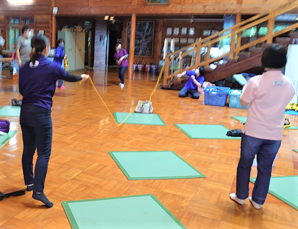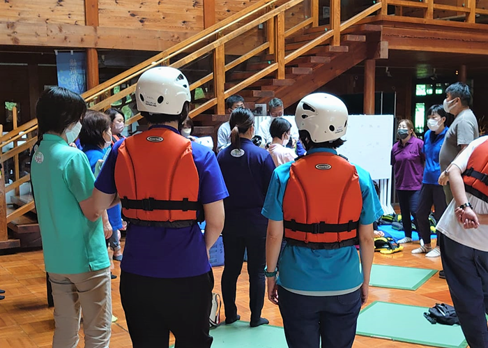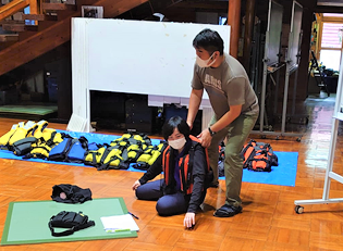 研修では、開催場所となる山口県油谷青少年自然の家(長門市)の活動エリアの注意点をはじめ、ライフジャケットの正しい装着、スローロープによる救助方法など、座学と基礎訓練を行いました。