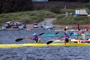 カヌーのレーシング競技で使われるカヌーです。レーシング競技は湖のように流れのない広い水面を使って、500m・1000mの直線のタイムを競う競技です。スピードが出るように、細くて長い形をしています。オリンピックの正式種目で、国体では少年の部もあります。