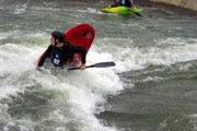 川にできる波を利用して、その場でサーフィン、スピン、縦スピン、ジャンプのような技を繰り出し、難易度などを競います。艇は回転性能重視なのでとても短く、2m前後しかありません。4mあるB&Gカヌーと比べると、半分しかないですね!