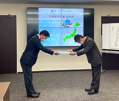 授与式には、新城市 下江洋行市長をはじめ、建部圭一副市長、安形博教育長など関係者約15名がご臨席される中、B&G財団 常務理事朝日田智昭から下江市長に、防災拠点整備・人材育成にかかる経費を3年間で総額5,400万円を上限に助成する「決定書」が手渡されました。