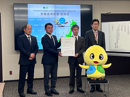 決定を受けた下江市長は「本市は山林に囲まれているため、土砂災害が想定される場所があります。幸いこれまで大規模な被害ないものの、近年の異常気象等の状況から、大規模な災害が発生してもおかしくない状況です。災害発生時は避難所の開設・運営が必須となるほか、土砂災害の場合は、土砂撤去に重機が必要になります。本事業で配備される機材を最大限に活用し、迅速に災害対応ができるよう、人材育成にも努めます。また、愛知県内で初めて防災拠点が設置されることもあり、周辺自治体と連携して災害時相互応援の体制づくりもしていきたい。B&G財団の災害支援の知見等も共有いただきながら、災害時の自助・共助の体制を構築していきたい。」旨お話しくださいました。