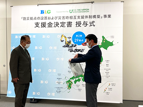 B&G財団は、2021年度から自治体と連携し、災害支援に即応できる機材と人材を備えた「防災拠点」を整備し、油圧ショベルとダンプカー、救助艇などの機材を配備すると共に、機材の操作方法と災害対応の研修を受けた人材を育成しています。