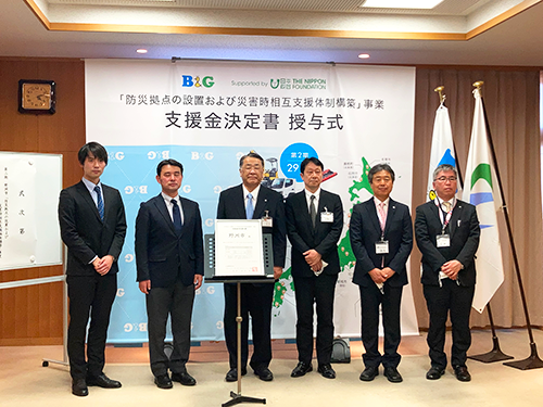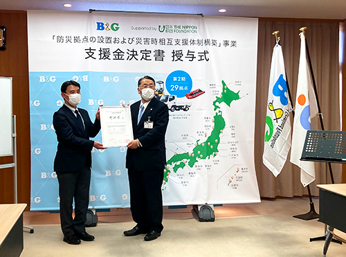 授与式には、野洲市 栢木進市長をはじめ、佐野博之副市長、西村健教育長など関係者約10名がご臨席される中、B&G財団 常務理事朝日田智昭から栢木市長に、防災拠点整備・人材育成にかかる経費を3年間で総額3,900万円を上限に助成する「決定書」が手渡されました。