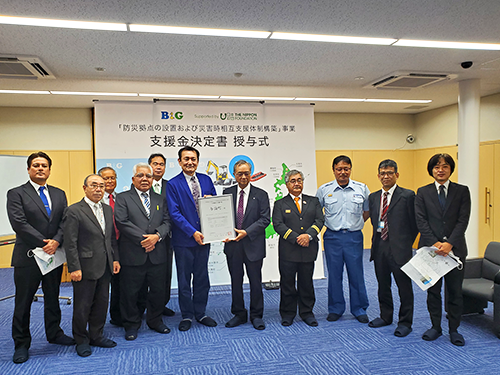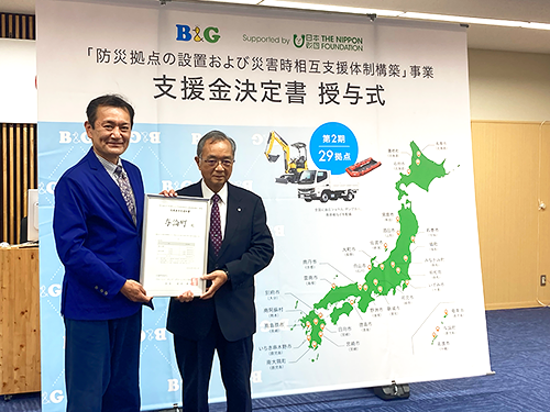 授与式には、与論町 山元宗町長をはじめ、久留満博副町長、町岡光弘教育長など関係者がご臨席される中、B&G財団 理事長菅原悟志から山町長に、防災拠点整備・人材育成にかかる経費を3年間で総額5,400万円を上限に助成する「決定書」が手渡されました。