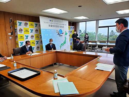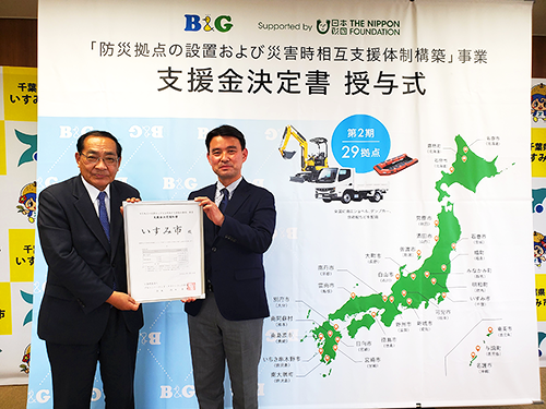 授与式には、いすみ市 太田洋市長をはじめ、上島浩一副市長など関係者がご臨席される中、B&G財団 常務理事 朝日田智昭から太田市長に、防災拠点整備・人材育成にかかる経費を3年間で総額5,400万円を上限に助成する「決定書」が手渡されました。