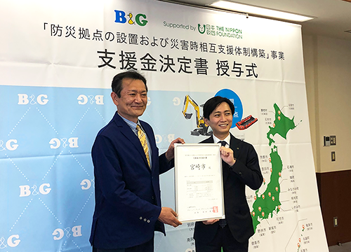 B&G財団は、2021年度から自治体と連携し、災害支援に即応できる機材と人材を備えた「防災拠点」を整備し、油圧ショベルとダンプカー、救助艇などの機材を配備すると共に、機材の操作方法と災害対応の研修を受けた人材を育成しています。