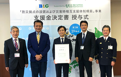 授与式には、宮崎市 清山知憲市長をはじめ、西田幸一郎教育長など関係者約15人がご臨席される中、B&G財団 理事長 菅原悟志から清山市長に、防災拠点整備・人材育成にかかる経費を3年間で総額3,900万円を上限に助成する「決定書」が手渡されました。