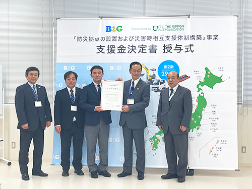 授与式には、いちき串木野市 中屋謙治市長をはじめ、出水喜三彦副市長、相良一洋教育長など関係者約15名がご臨席される中、B&G財団常務理事 朝日田智昭から中屋市長に、防災拠点整備・人材育成にかかる経費を3年間で総額4,400万円を上限に助成する「決定書」が手渡されました。