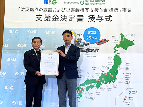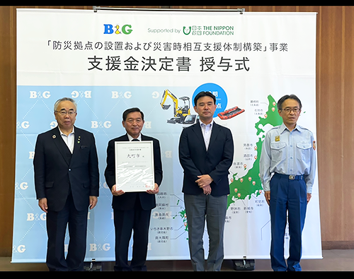 B&G財団は、2021年度から自治体と連携し、災害支援に即応できる機材と人材を備えた「防災拠点」を整備し、油圧ショベルとダンプカー、救助艇などの機材を配備すると共に、機材の操作方法と災害対応の研修を受けた人材を育成しています。
